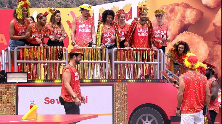 O Líder da semana, Paulo André, lê uma plaquinha com as informações sobre o evento: "Fala, PA! Olha só essa novidade: agora o Mc tem produtos tamanho mega para comer sozinho ou dividir com a galera. As embalagens dos produtos mega são recicláveis, feitas de papel 100% certificados. Afinal, compartilhar os produtos também é consumir menos embalagens. E, para curtir esse mega momento, o Mc trouxe um carnaval para vocês dividirem a alegria e, claro, os produtos mega do Mc. Partiu Mega Mc Bloco?".