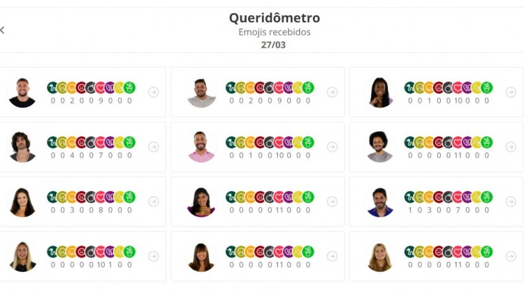 A noite anterior teve show do Dennis na Festa Above do BBB21. Rolou muita animação, funk, rebolados e, é claro, papos sobre o jogo! No Queridômetro deste sábado, 27/3, os confinados avaliaram seus colegas com muitos emojis de "coração" e de "carinha feliz".