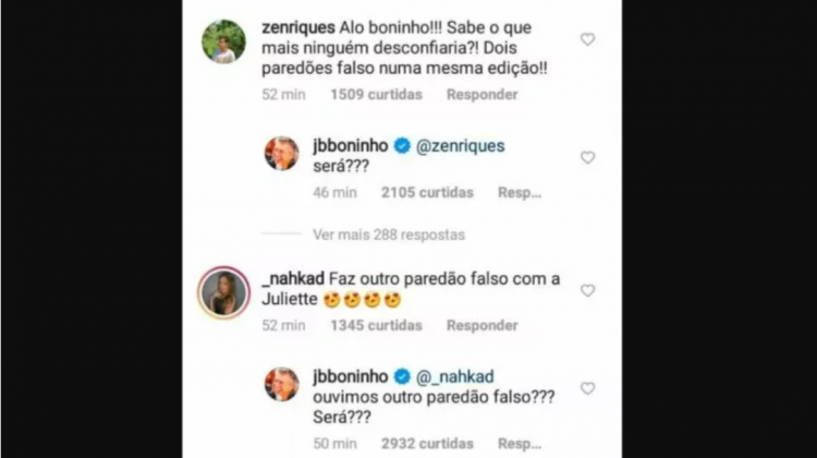 Após a volta de Carla Diaz à casa do Big Brother, colocando assim fim ao paredão falso da edição, Boninho recebeu um pedido em um comentário no Instagram: “faz outro paredão falso com a Juliette“. “Ouvimos outro paredão falso? Será?”, sugeriu o chefão do reality show.