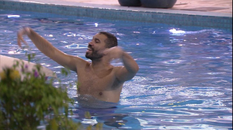 Agora é a vez dos brothers curtirem as músicas que estão tocando na casa. Gilberto pula na piscina e dança 'Onda Diferente', música de Ludmilla, Anitta e Snopp Dogg.