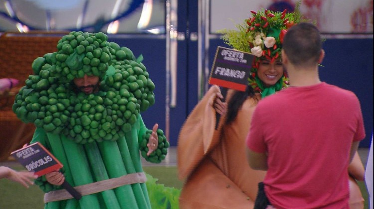 Projota e Pocah cumprem pela primeira vez o Castigo do Monstro 'Marmita' nesta sexta-feira, 26/02. Os brothers seguem para a área externa vestidos com as fantasias. Projota está vestido de brócolis e Pocah de frango assado. Eles dançam em cima de 'marmitas'.