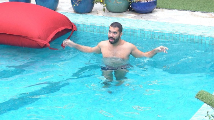 Gilberto canta e dança na piscina sozinho enquanto alguns brothers descansam após madrugada de festa.